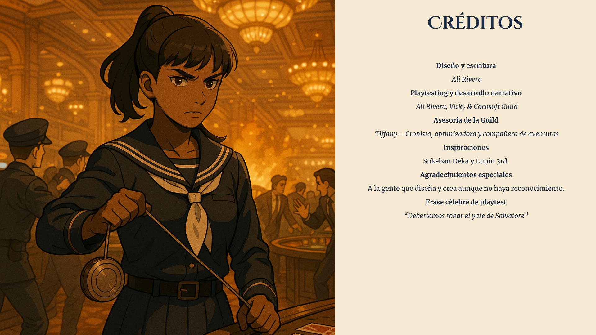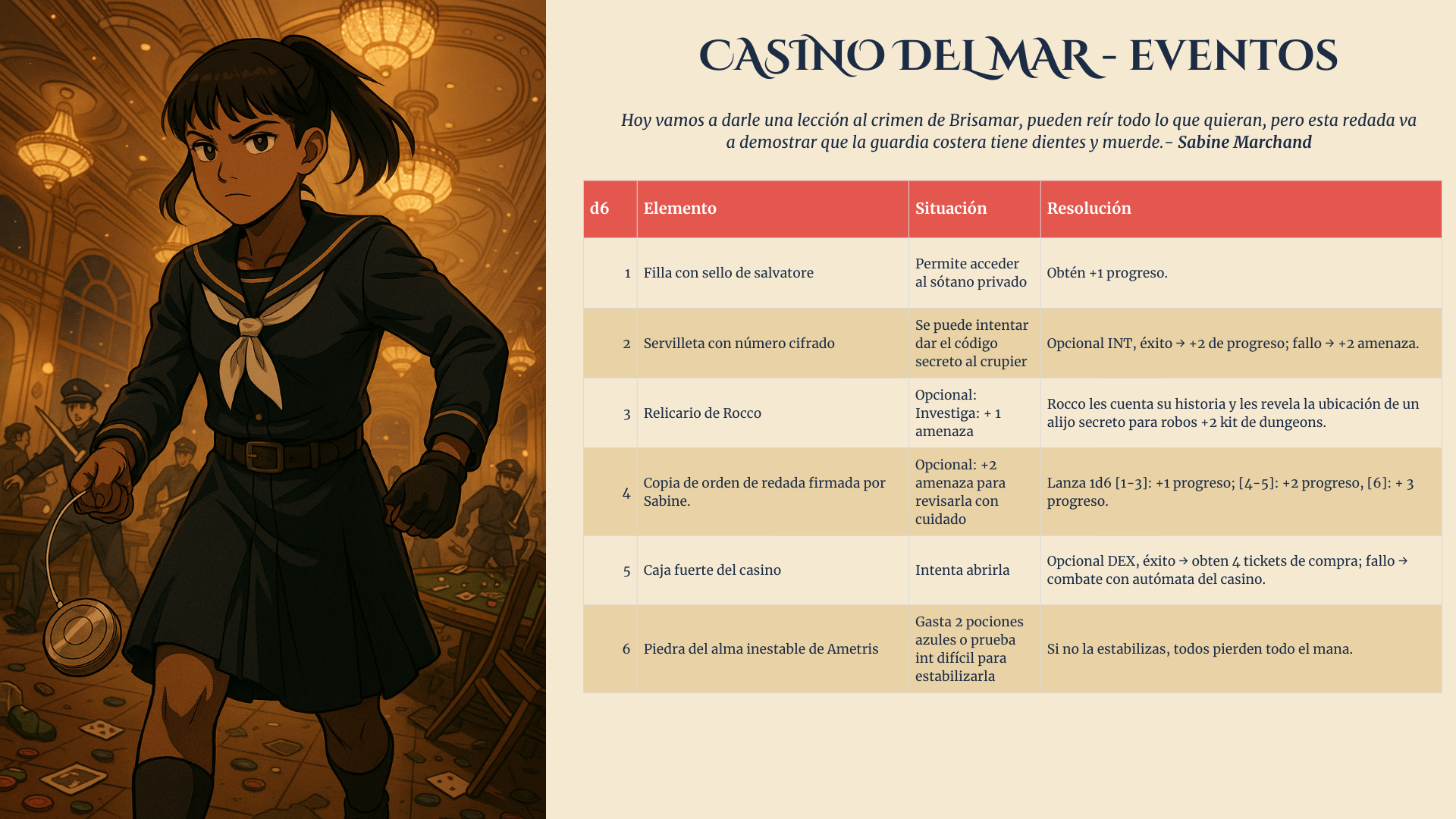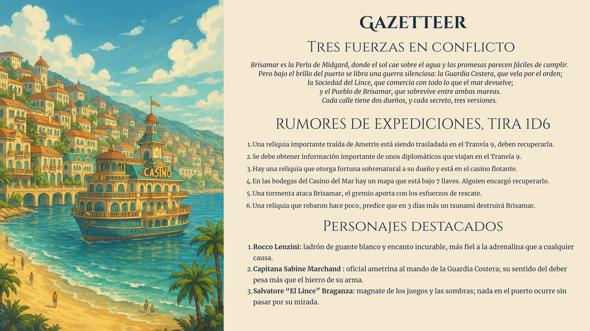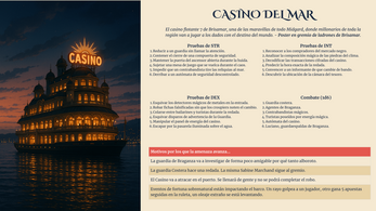 - Casino del Mar — El casino flotante más famoso de Midgard resguarda un amuleto capaz de torcer la suerte. Entre luces, música y trampas, deberás moverte rápido antes que la Guardia Costera realice una redada… o antes que los hombres de Braganza te encuentren primero.